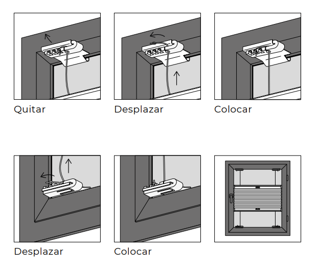 Desplazamos el nudo del cordón hacia las ranuras previstas para mantenerlo. Movemos el nudo a la ranura exterior (alejada del centro de la ventana) para tensar, o a la ranura interior (hacia el centro de la ventana) para liberar la tensión.