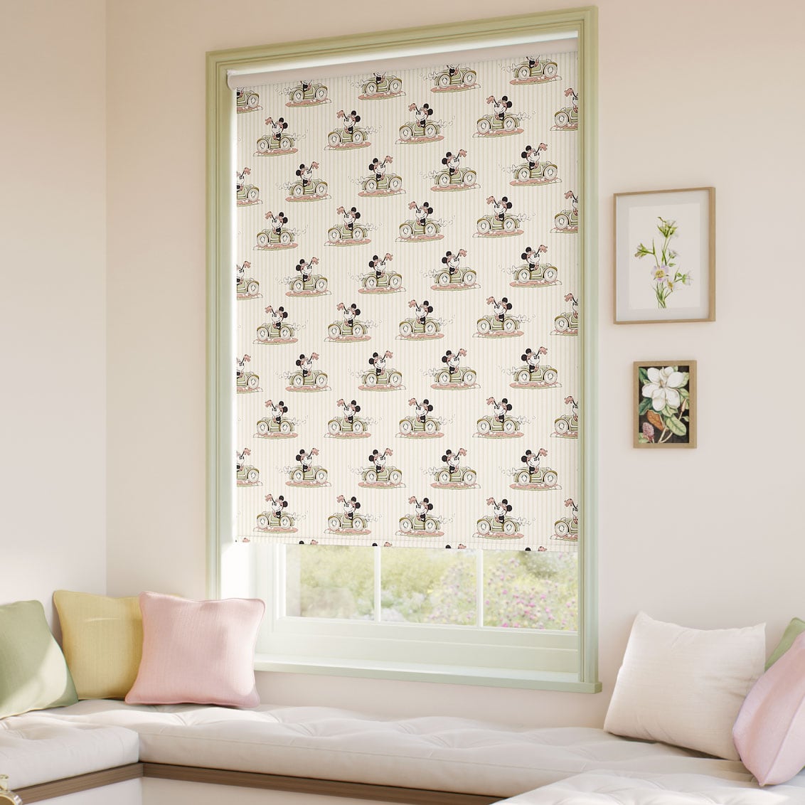 Inspirado en un precioso papel de pared pintado a mano encontrado en el archivo de Sanderson, este hermoso estampado repetitivo presenta a Minnie Mouse de Disney paseando en su coche descapotable, saludando a sus amigos mientras pasa.
